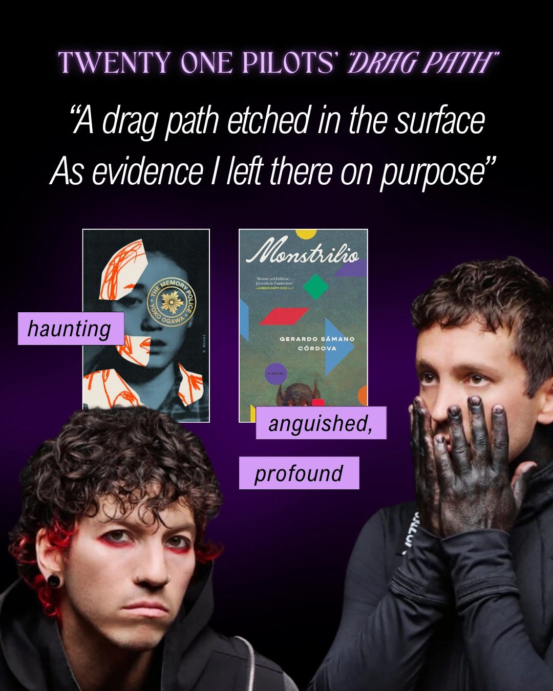 For books like “Drag Path” by Twenty One Pilots, check out: